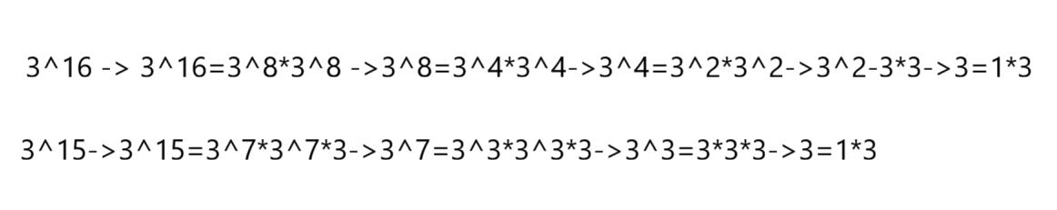 如果求的奇数次方呢?比如3的15次方,那就先求3的7次方,3^7*3^7*3=3^15,同理向下细分求解。