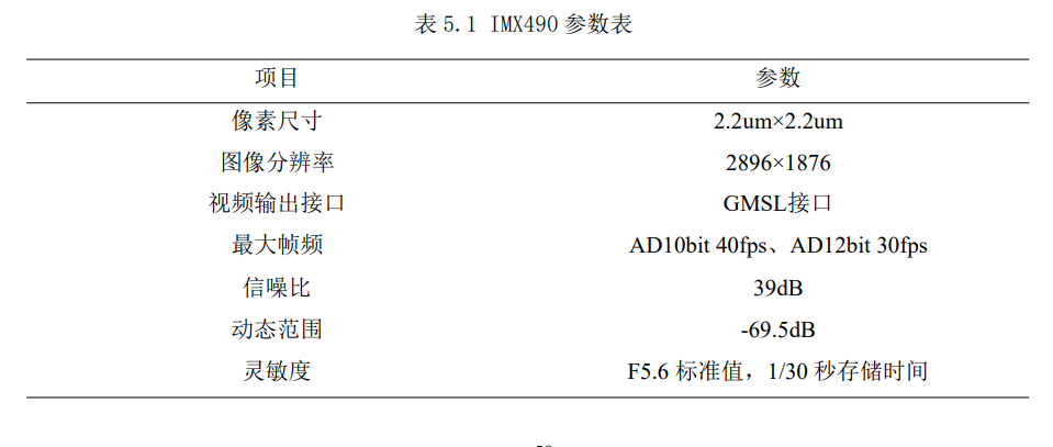 IMX490 图像传感器通过改变图像采集窗口的比例输出不同的分辨率图像。在视 频采集时通过 IIC 总线向 IMX490 发送内部寄存器配置信息完成相机初始化,图像输 出从而实现对分视频辨率、视频输出格式、视频图像色度和图像画面对比度等工作状 态的参数设置。IMX490 相机的具体参数如下表 5.1 所示。