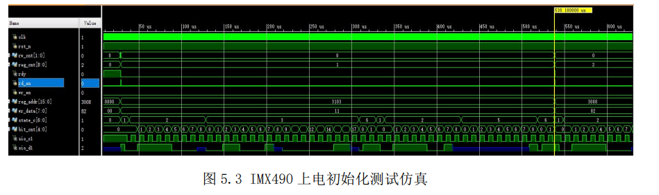 5.2 GMSL 视频采集与转换单元测试分析 连接好 GMSL 相机与视频采集板后对系统上电,在 FPGA 端通过 ISE14.7 自带的 仿真器对 IMX490 摄像头上电初始化的 IIC 总线数据传输进行波形仿真得出图 5.3 上 电时序仿真波形,通过仿真出来的时序图可以看出传输一个字节需要 9 个时钟周期, 写时序和读时序和软件程序设计一致。在 ISE14.7 中对 IMX490 摄像头采集模块顶层 模块程序进行编译,还可以得到 RTL 电路图。