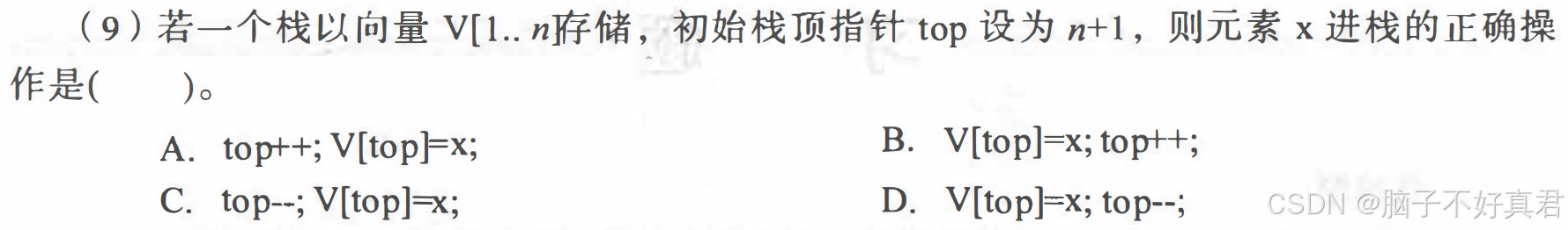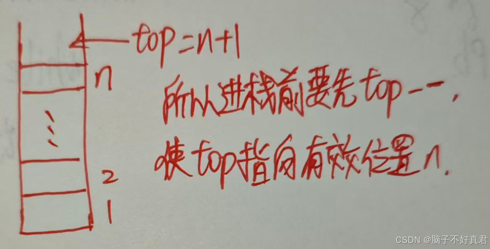 // 元素进栈 int Push(DblStack *S, int i, SElemType x) {if (StackFull(S)) {return 0; // 栈满,进栈失败}if (i == 0) { // 0号栈进栈S->top[0]++; // 栈顶指针右移S->v[S->top[0]] = x; // 存入元素} else if (i == 1) { // 1号栈进栈S->top[1]--; // 栈顶指针左移S->v[S->top[1]] = x; // 存入元素} else {return 0; // 栈编号错误}return 1; // 进栈成功 }