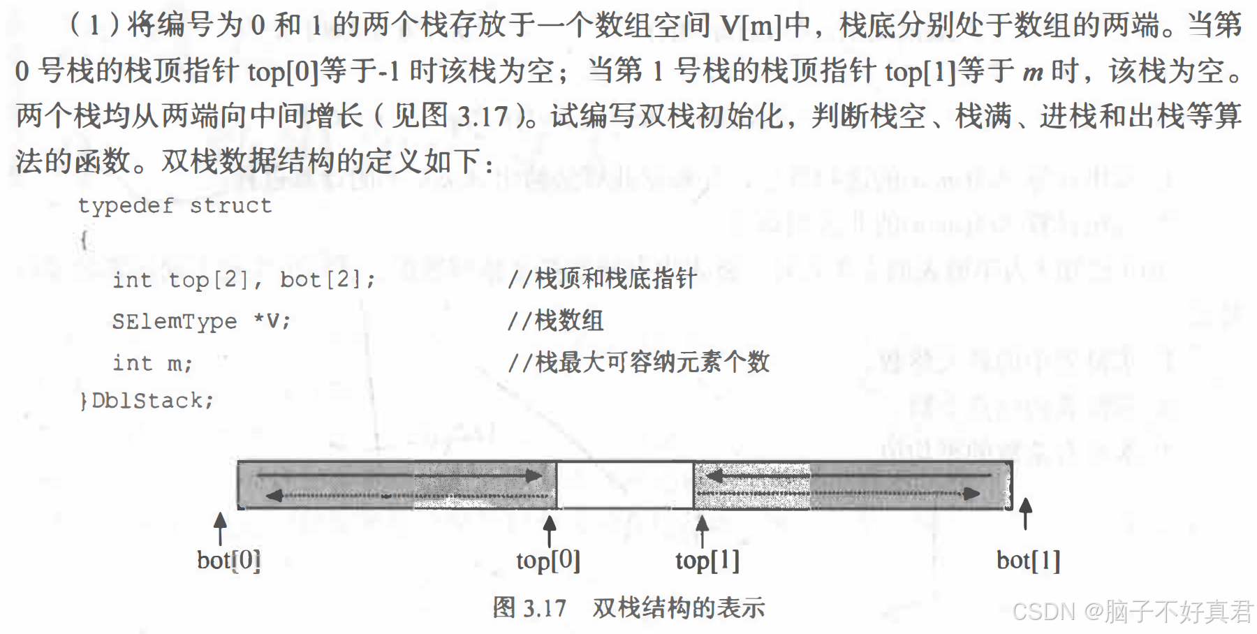 // 双栈初始化 int InitDblStack(DblStack *S, int maxsize) {S->v = (SElemType *)malloc(sizeof(SElemType) * maxsize);if (!S->v) {return 0; // 内存分配失败}S->m = maxsize;// 0号栈:从数组左端向右增长S->bot[0] = 0;S->top[0] = -1; // 栈空条件:top[0] == -1// 1号栈:从数组右端向左增长S->bot[1] = maxsize - 1;S->top[1] = maxsize; // 栈空条件:top[1] == mreturn 1; // 初始化成功 }