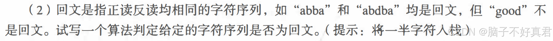 // 定义顺序栈的存储结构 #define StackSize 100 // 预分配的栈空间最多为100个元素 typedef char DataType; // 栈元素的数据类型为字符typedef struct {DataType data[StackSize]; // 栈的存储数组int top; // 栈顶指针 } SeqStack;// 函数功能:判断字符向量是否为回文 // 参数说明:bunch - 待判断的字符串指针 // 返回值:1表示是回文,0表示不是回文 int IsHuiwen(char *bunch) {SeqStack s; // 定义顺序栈int i, len; // i:循环计数器,len:字符串长度char temp; // 临时变量,用于存储出栈的字符// 初始化栈InitStack(&s);// 获取字符串长度len = strlen(t);// 将字符串的前半部分字符入栈// 例如:"abcdcba" -> 前3个字符"abc"入栈for (i = 0; i < len / 2; i++) {Push(&s, bunch[i]);}// 处理奇数长度字符串的中间字符// 如果长度为奇数,从中间字符的下一个开始比较// 如果长度为偶数,直接从后半部分开始比较if (len % 2 == 0) {i = len / 2; // 偶数长度:从中间开始比较} else {i = len / 2 + 1; // 奇数长度:跳过中间字符}// 依次弹出栈中字符与字符串后半部分比较while (!EmptyStack(&s)) {temp = Pop(&s); // 弹出栈顶字符// 比较弹出的字符与字符串对应位置的字符if (temp != bunch[i]) {return 0; // 发现不匹配,不是回文} else {i++; // 继续比较下一个字符}}// 所有字符都匹配,是回文return 1; }