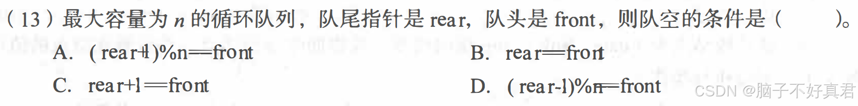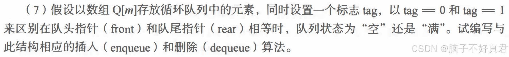 #define MAXSIZE 100 // 队列最大容量typedef struct {int *Q; // 存放队列元素的数组int front; // 队头指针int rear; // 队尾指针 int tag; // 队列状态标志:0-空,1-满int m; // 队列实际容量 } CycleQueue;