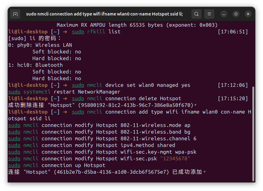 sudo nmcli connection modify Hotspot wifi-sec.psk "你的密码"