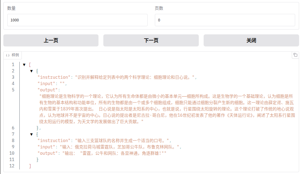 选择数据集(alpaca_zh_demo),点击“预览数据集”能看到: