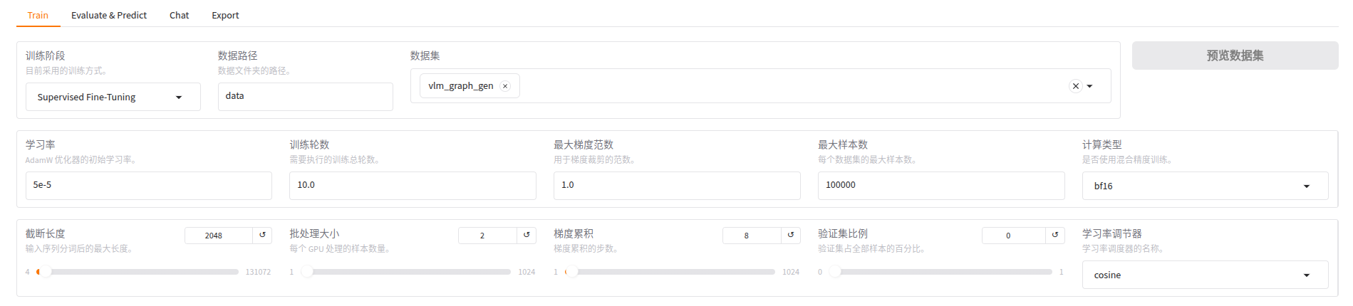 提供了“ 一站式”的操作界面,通过可视化操作,就可以完成对LLMs 或 VLMs的微调了
