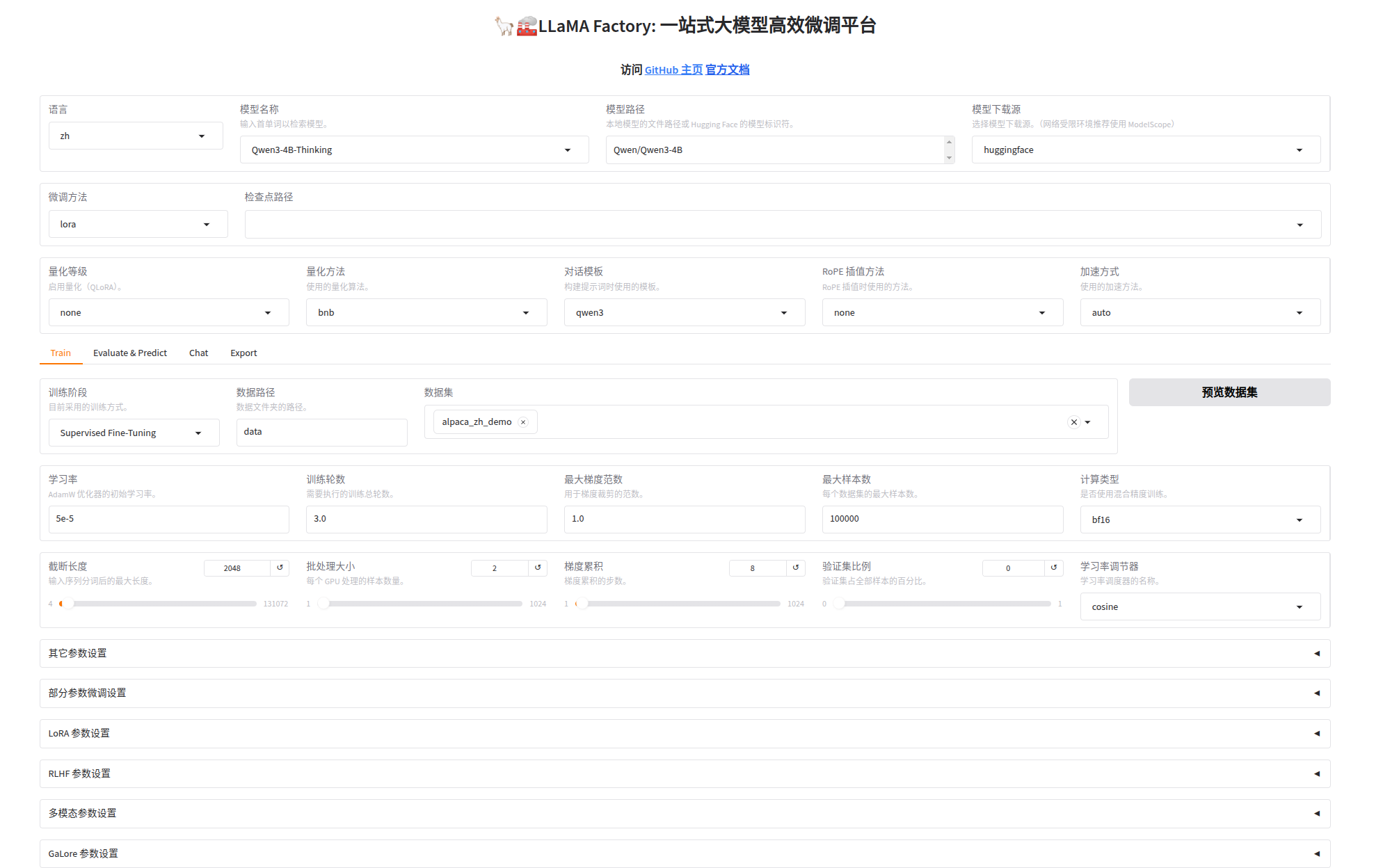 - 实验监控:LlamaBoard、TensorBoard、Wandb、MLflow、SwanLab 等等。