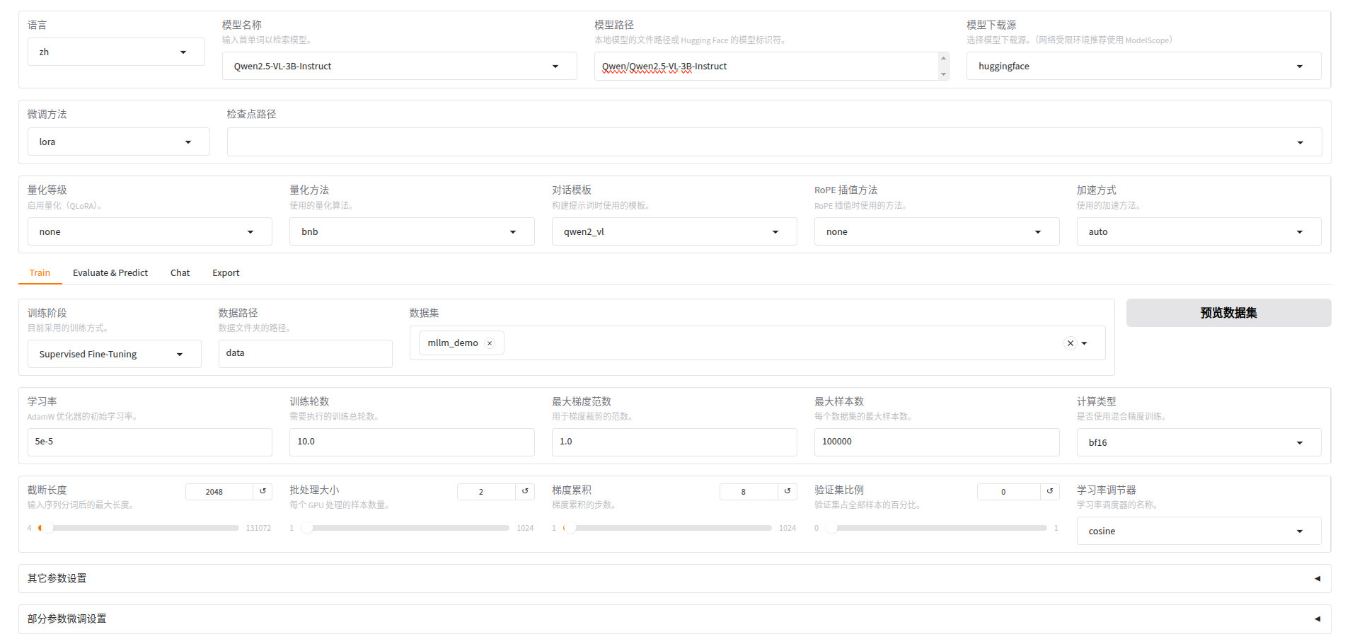 然后我们选择模型(Qwen/Qwen2.5-VL-3B-Instruct)、微调方法(lora)、训练方式(Supervised Fine-Tuning)监督微调