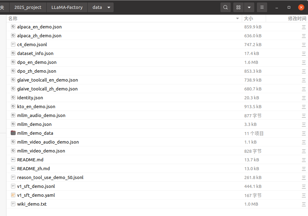 首先看看数据集的目录,有上面微调训练用到的alpaca_zh_demo.json、mllm_demo.json,
