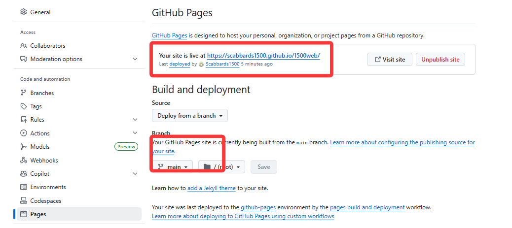 上传一个html 后setting pages 这里选择你自己的分支,我选的是mian,过一会上边就会出现你的web 的网址了