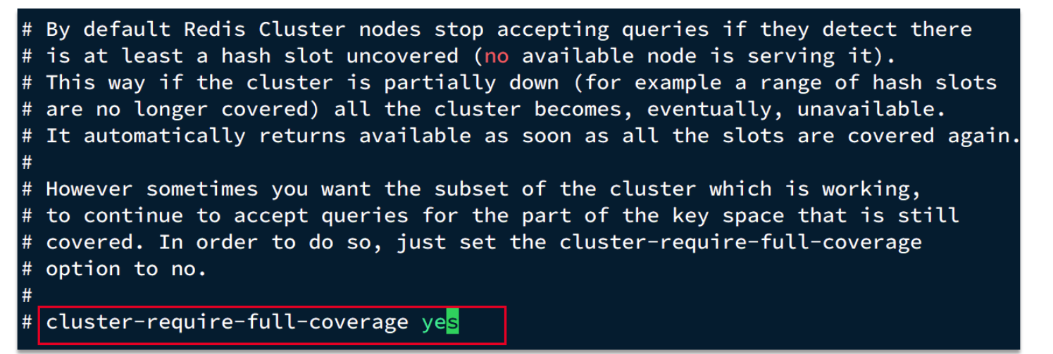 大家可以设想一下,如果有几个slot不能使用,那么此时整个集群都不能用了,我们在开发中,其实最重要的是可用性,所以需要把如下配置修改成no,即有slot不能使用时,我们的redis集群还是可以对外提供服务