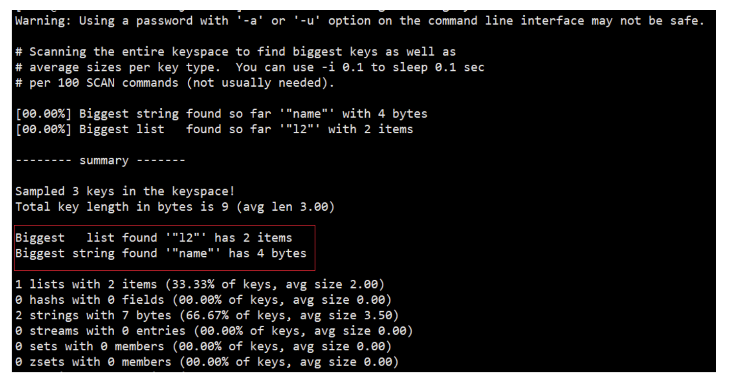 利用redis-cli提供的--bigkeys参数,可以遍历分析所有key,并返回Key的整体统计信息与每个数据的Top1的big key