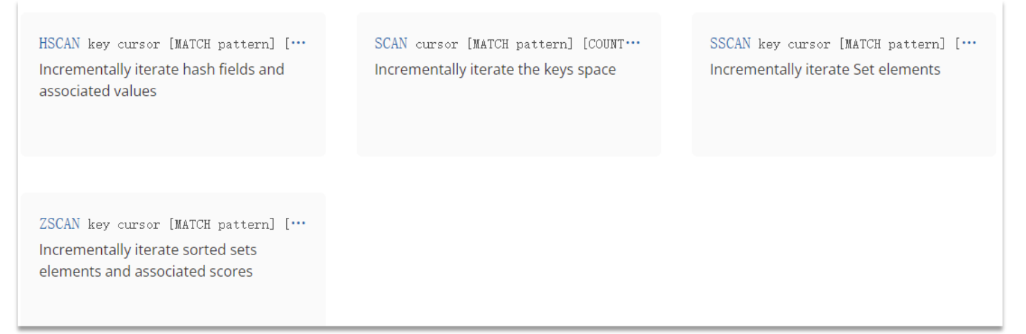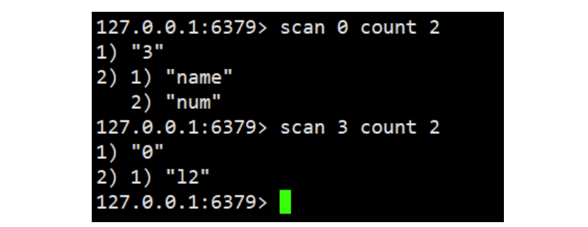 scan 命令调用完后每次会返回2个元素,第一个是下一次迭代的光标,第一次光标会设置为0,当最后一次scan 返回的光标等于0时,表示整个scan遍历结束了,第二个返回的是List,一个匹配的key的数组