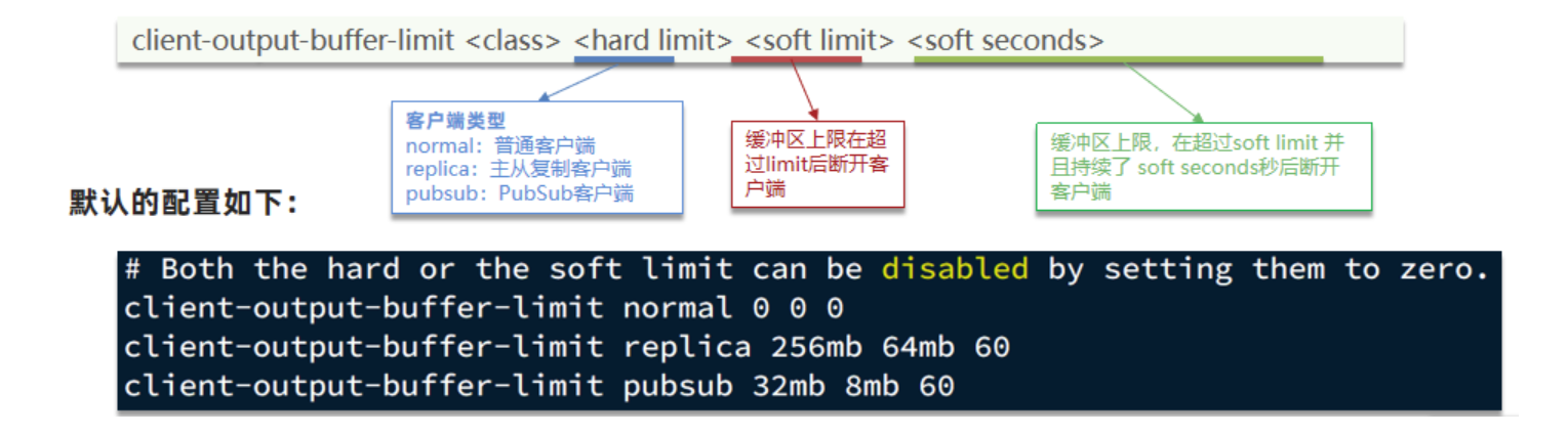 客户端缓冲区:指的就是我们发送命令时,客户端用来缓存命令的一个缓冲区,也就是我们向redis输入数据的输入端缓冲区和redis向客户端返回数据的响应缓存区,输入缓冲区最大1G且不能设置,所以这一块我们根本不用担心,如果超过了这个空间,redis会直接断开,因为本来此时此刻就代表着redis处理不过来了,我们需要担心的就是输出端缓冲区