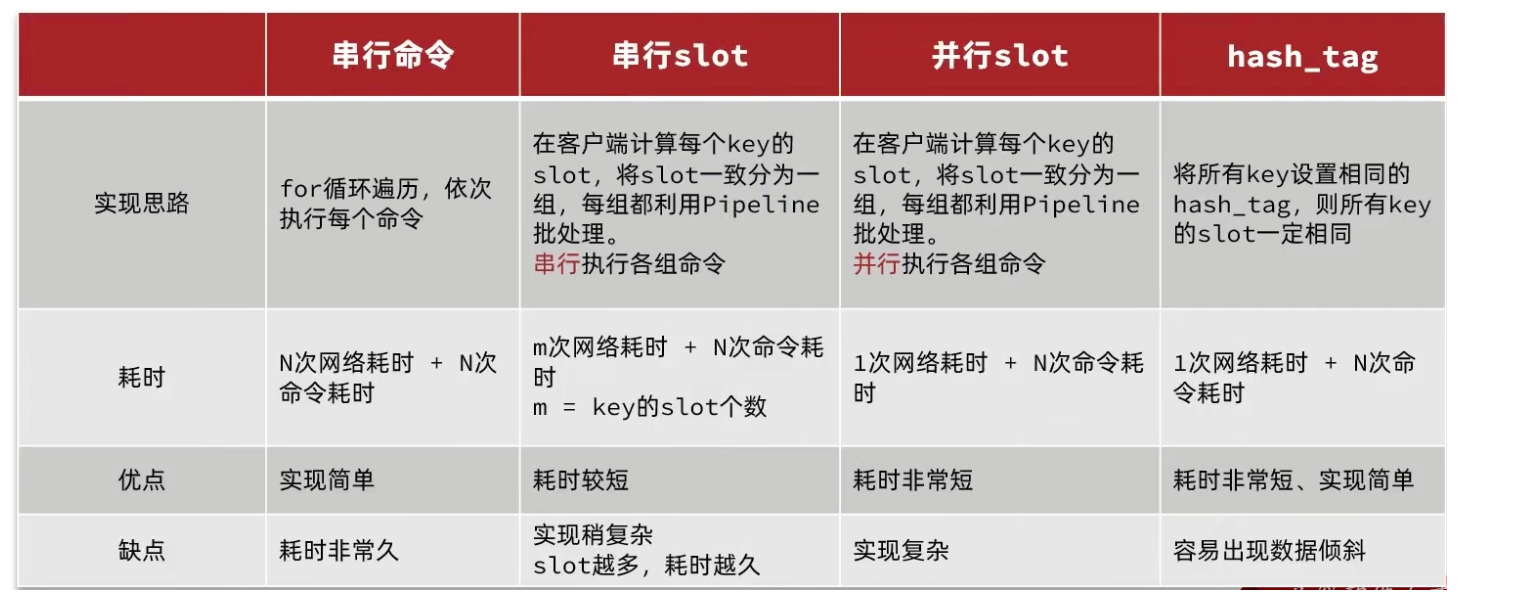 有关这个问题咱们已经探讨过了,当我们使用批处理的命令时,redis要求我们的key必须落在相同的slot上,然后大量的key同时操作时,是无法完成的,所以客户端必须要对这样的数据进行处理,这些方案我们之前已经探讨过了,所以不再这个地方赘述了。