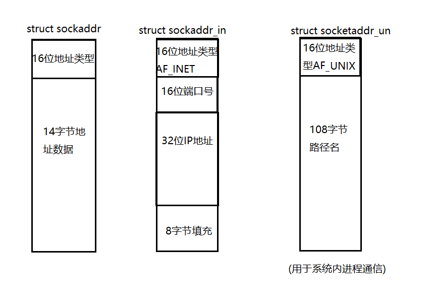 struct sockaddr { sa_family_t sin_family;//地址族char sa_data[14]; //14字节,包含套接字中的目标地址和端口信息 };