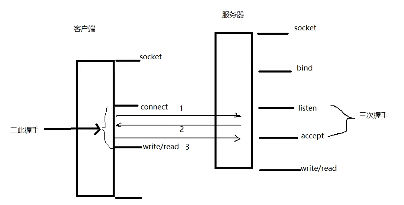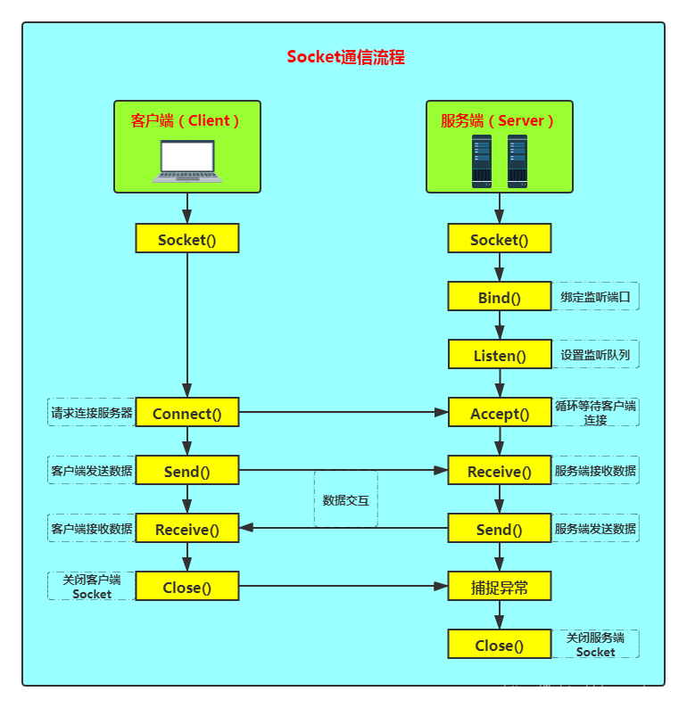 服务器先初始化socket,绑定ip和端口号,设置监听队列,调用accept阻塞,等待客户端连接。在这时如果有个客户端初始化一个Socket,然后连接服务器(connect),如果连接成功,这时客户端与服务器端的连接就建立了。客户端发送数据请求,服务器端接收请求并处理请求,然后把回应数据发送给客户端,客户端读取数据,最后关闭连接,一次交互结束。