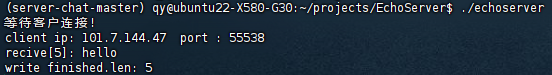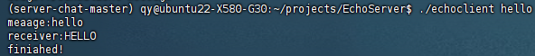 int main(int argc,char * argv[]){ int sockfd; char *message;struct sockaddr_in servaddr;int n,ret;char buf[64];if(argc != 2){fputs("Usage:./echoclient message\n",stderr);exit(1);} //确定运行格式正确message = argv[1];printf("meaage:%s\n",message);sockfd = socket(AF_INET,SOCK_STREAM,0);//初始化套接字if(sockfd == -1) perror_exit("create socket");memset(&servaddr,'\0',sizeof(struct sockaddr_in));servaddr.sin_family = AF_INET;//协议族inet_pton(AF_INET,SERVER_IP,&servaddr.sin_addr);//将字符串转成网络编码格式servaddr.sin_port = htons(SERVER_PORT);//将16位主机字节序转为网络字节序ret = connect(sockfd,(struct sockaddr *) &servaddr,sizeof(servaddr));//发出连接请求if(ret == -1) perror_exit("connect");ret = write(sockfd,message,strlen(message)); //发送数据if(ret == -1) perror_exit("write");n = read(sockfd,buf,sizeof(buf) - 1);if(n == -1) perror_exit("read");if(n > 0){buf[n] = '\0';printf("receiver:%s\n",buf);}else{perror("error!!!");}printf("finiahed!\n");close(sockfd);return 0;