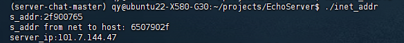 #include <arpa/inet.h>int main(){char ip[] = "101.7.144.47";char server_ip[64];struct sockaddr_in server_addr;inet_pton(AF_INET,ip,&server_addr.sin_addr.s_addr);printf("s_addr:%x\n",server_addr.sin_addr.s_addr);printf("s_addr from net to host: %x\n",ntohl(server_addr.sin_addr.s_addr));inet_ntop(AF_INET,&server_addr.sin_addr.s_addr,server_ip,64);printf("server_ip:%s\n",server_ip);return 0;