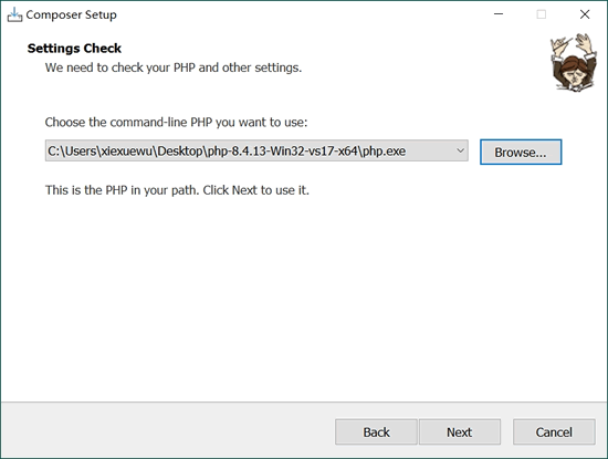 ② 点击 browse 打开 php 文件夹下的 php.exe,然后点击 Next: