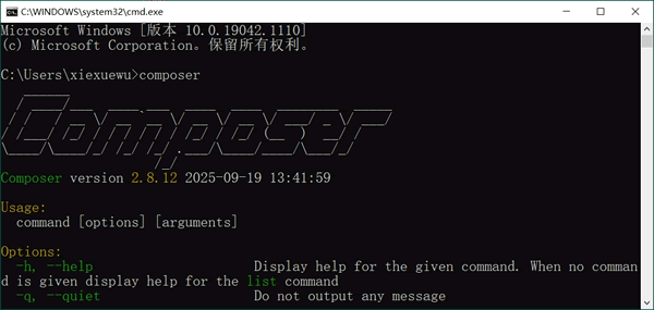 ④ 按组合键 win + R 输入 cmd 出现命令提示框,输入 composer 回车,看到下图的输出信息证明安装成功:
