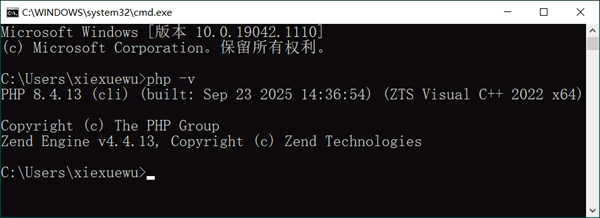 按组合键 win + R 输入 cmd 出现命令提示框,输入 php -v 回车,看到 PHP 的版本信息证明配置成功: