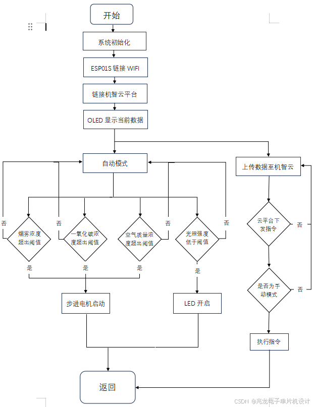 {ADCX_Init();Timer2_Init(9,14398);Uart2_Init(9600);Uart1_Init(115200);OLED_Init();Bmp_Init();DHT11_Init();Key_Init();MOTOR_Init();LED_Init();Buzzer_Init();while (1){SensorScan(); //获取传感器数据switch (oledPages){case DISPLAY_PAGE1:OLED_Menu1(); //显示主页面1固定信息SensorDataDisplay1();//显示传感器1数据MotorOperation();/*按键按下时进入主页面2*/if (KeyNum == KEY_2){KeyNum = 0;oledPages = DISPLAY_PAGE2;OLED_Clear();}/*按键按下时切换模式*/if (KeyNum == KEY_1){KeyNum = 0;model = !model;if (!model){LED_OFF();Buzzer_OFF();}}/*按键按下时进入阈值设计界面*/if (KeyNum == KEY_Long1){KeyNum = 0;oledPages = SETTINGS_PAGE;OLED_Clear();}break;case DISPLAY_PAGE2:OLED_Menu2();SensorDataDisplay2();MotorOperation();/*按键按下时进入主页面2*/if (KeyNum == KEY_2){KeyNum = 0;oledPages = DISPLAY_PAGE1;OLED_Clear();} break;case SETTINGS_PAGE:OLED_SetInterfacevoid(); //显示阈值设置界面的固定内容OLED_Option(SetSelection()); //实现阈值设置页面的选择功能ThresholdModification(SetSelection()); //实现阈值调节功能 //判断是否退出阈值设置界面if (KeyNum == KEY_2){KeyNum = 0;oledPages = DISPLAY_PAGE1; //跳转到主界面OLED_Clear(); //清屏}break;default: break;} }