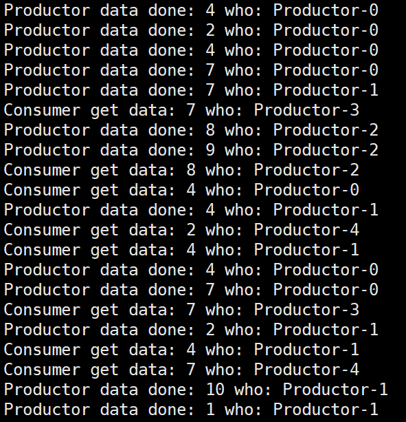 {srand(time(nullptr) ^ getpid()); //^getpid()仅仅只是为了更加离散RingQueue<int>* rq = new RingQueue<int>();pthread_t c[5], p[3];for(int i = 0; i < 3; i++){ThreadData* td = new ThreadData();td->rq = rq;td->threadname = "Productor-" + std::to_string(i);pthread_create(p + i, nullptr, Productor, td);}for(int i = 0; i < 5; i++){ThreadData* td = new ThreadData();td->rq = rq;td->threadname = "Productor-" + std::to_string(i);pthread_create(c + i, nullptr, Consumer, td);}for(int i = 0; i < 3; i++){pthread_join(p[i], nullptr);}for(int i = 0; i < 5; i++){pthread_join(c[i], nullptr);}return 0;