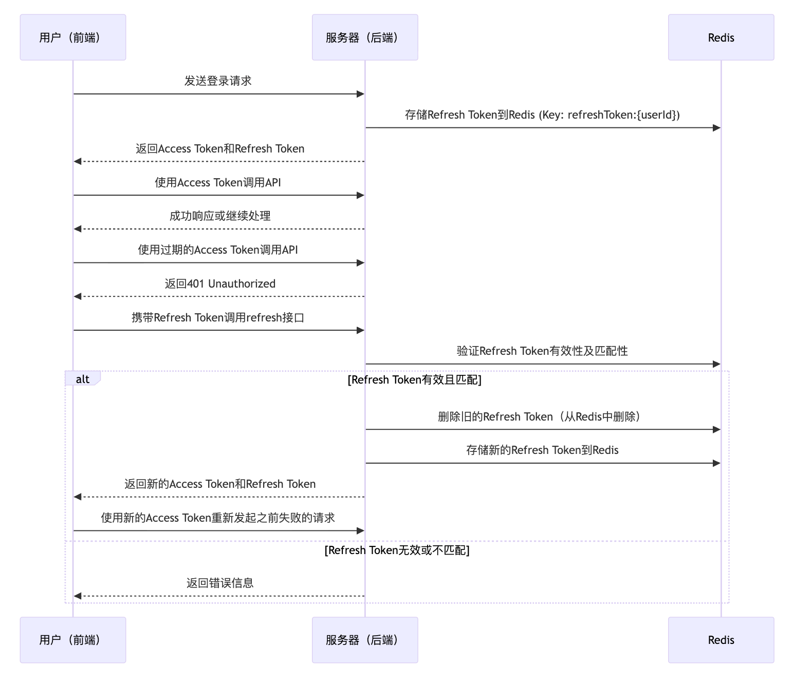 - Refresh Token有效并且匹配,后端生成新的Access Token和新的Refresh Token,删除旧的Refresh Token,并且存储新的Refresh Token;后端执行成功,返回新的Access Token 和Refresh Token;若Refresh Token无效,则返回错误信息
