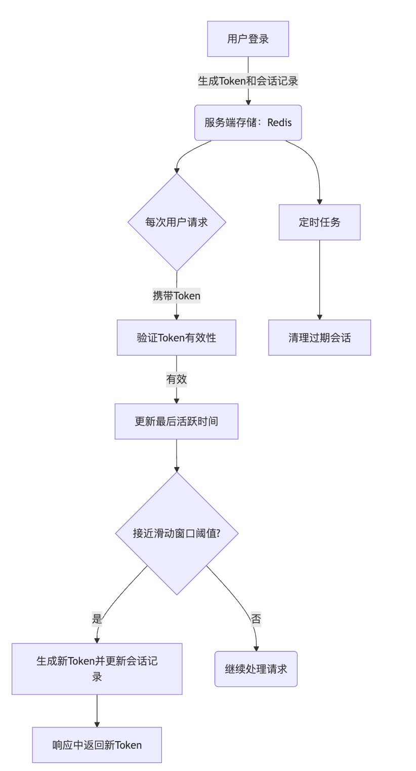 此方案和滑动窗口方案有类似之处,但是此方案更侧重于服务端主动管理和维护会话状态。并且此处的服务端自动续期是有状态的,依赖redis等存储来维护会话。然而滑动窗口方案是无状态的,只需要依赖Token本身即可。