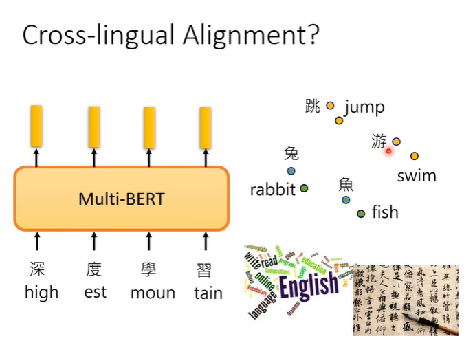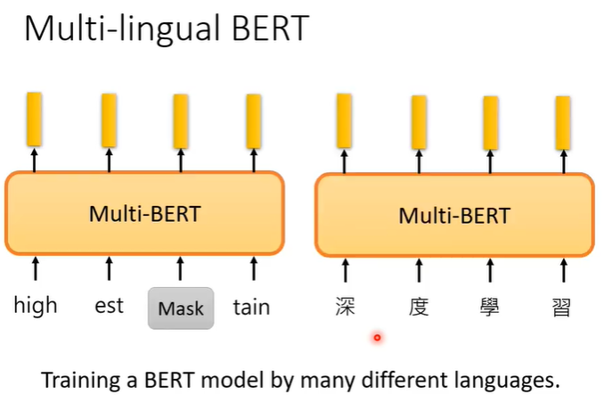 Mulit-lingual BERT可以说是多语言的BERT,在训练时会用各种各样的语言训练。