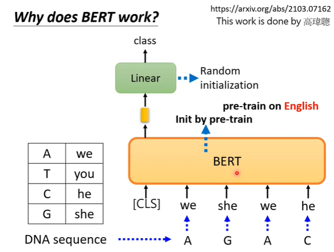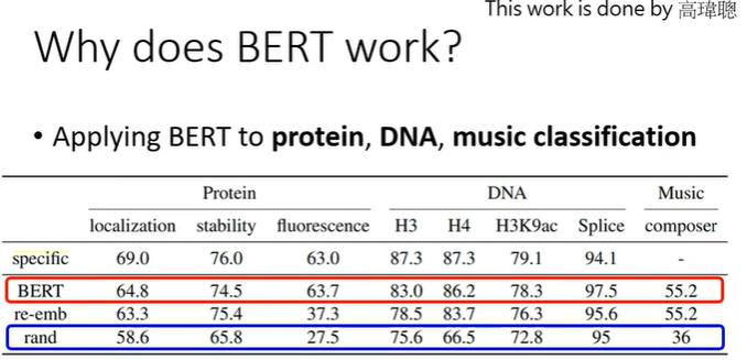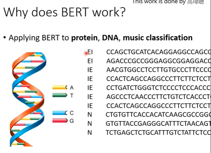 还有另一个实验结果,将BERT用于DNA的分类,DNA有四种核糖核酸A,T,C,G根据不同的排列顺序决定DNA的类别。