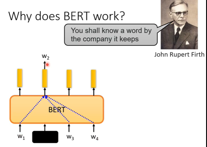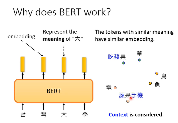 每个文字都有对应的向量,称为embedding,这个向量代表他们的意思,具体来说,假设把这些向量画出来,或者计算他们之间的距离,会发现意思越相近的字向量就越接近,同时BERT也会考虑上下文,判断字的意思。