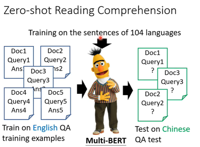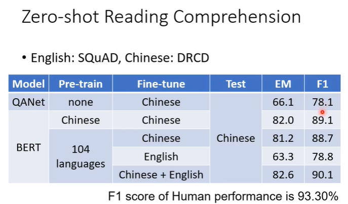 用一个真实实验的数据举例,F1对应正确率,人在同样的资料上有93%的正确率。在不用BERT时效果不佳,正确率只有78%。使用BERT后,如果是pre-train在中文上,在中文QA资料上训练,测试在中文问题上,正确率有89%。如果是多个语言的BERT,在英文QA资料上训练,测试在中文问题上,正确率有78.8%跟不用BERT差不多,但是它从未看过中文的QA资料。