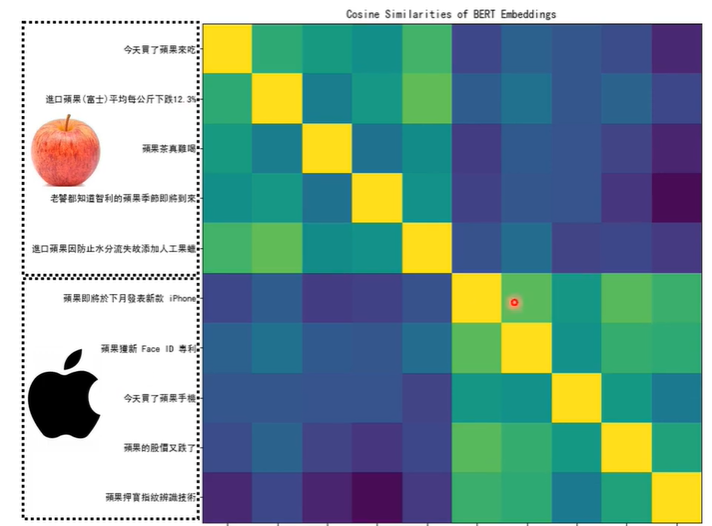 用10个句子测试的示例如下图,前五个句子代表可以食用的“果”,后五个句子代表品牌中的“果”,计算他们向量的距离会得到10x10的矩阵,越偏黄色代表相似度越高,不难看出前五个句子之间和后五个句子之间的相似度要高于前五句和后五句之间的相似度。
