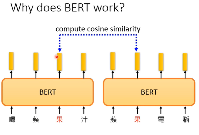 举一个实际的例子,假设我们现在考虑“果”这个字,我们就收集很多带有“果”的句子丢到BERT里,接下来我们再去计算每一个“果”所对应的embedding,如下图的“喝苹果汁”和“苹果电脑”,他们的两个向量不会一样,因为BERT是一个encoder,里面有self-attention可以根据上下文不同得到不同的向量。