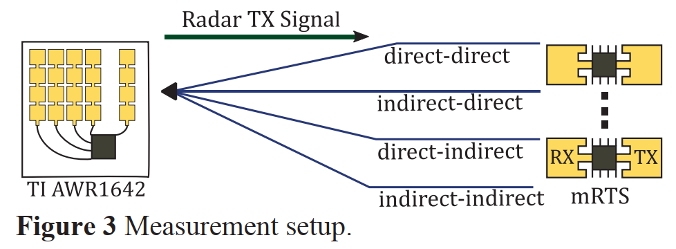 此图描绘了实验装置的布局。AWR1642雷达作为发射源(TX)和接收机(RX)。在距离雷达约0.8米的位置,阵列式地放置了多个mRTS单元。这些mRTS单元接收到雷达发射的信号后,并不会像真实目标那样直接反射,而是会根据预设的程序,对信号进行精确的延迟、多普勒频移和相位调整,然后再将信号发射回雷达的接收机。通过为四个mRTS单元分别编程,使其精确模拟前述理论模型中的四条传播路径(直接-直接、间接-间接、直接-间接、间接-直接)的参数,从而在硬件层面上“合成”出一个带有完整多径效应的虚拟目标。