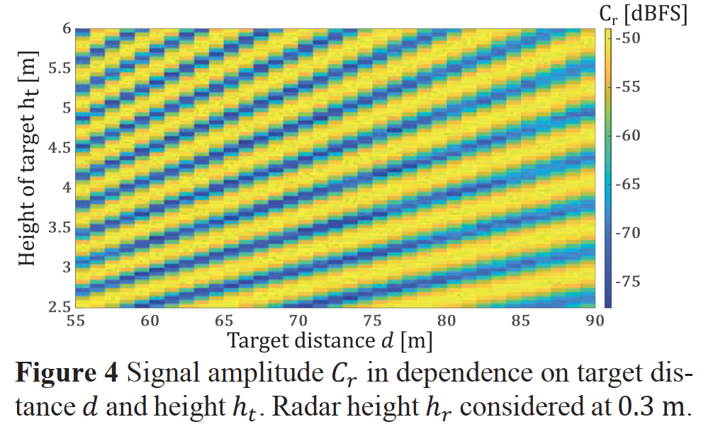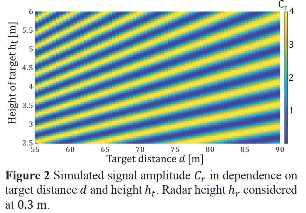 在仿真中,研究人员做了一些理想化假设,例如所有路径的回波幅度都相等(An=1A_n=1An=1),即地面为理想的无损反射面,并且雷达自身是静止的(vr=0v_r=0vr=0)。然后,通过在程序中不断改变目标距离 ddd 和目标高度 hth_tht(雷达高度固定为 hr=0.3h_r=0.3hr=0.3 米),计算出合成信号的总幅度 CrC_rCr。仿真结果被绘制成一幅二维彩色图。