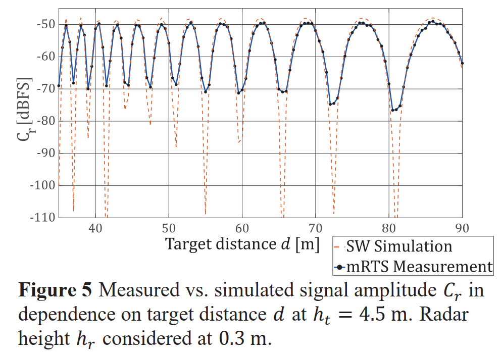 这张线图的横轴是目标距离 ddd,纵轴是信号幅度 CrC_rCr(单位dBFS)。图中包含两条曲线:一条是经过调整的软件仿真结果(SW Simulation),另一条是mRTS的实际测量数据(mRTS Measurement)。为了便于比较,仿真的线性幅度被转换成了对数刻度,并且应用了一个简化的自由空间路径损耗模型。从图中可以非常直观地看到,两条曲线的振荡模式——即波峰和波谷出现的位置——吻合得非常好,这表明所建立的几何模型和相位关系是准确的。