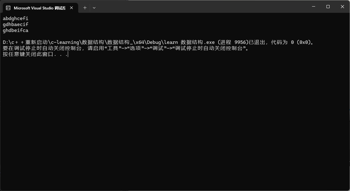 {const char nullNpde = '-';char a[15] ={nullNpde,'a','b','c','d',nullNpde,'e','f','g','h',nullNpde,nullNpde,nullNpde,nullNpde,'i'};Tree<char>T(15);T.creatTree(a, 15, nullNpde);T.preorder(); cout << endl;T.inorder(); cout << endl;T.postorder(); cout << endl;return 0;}