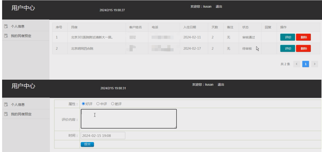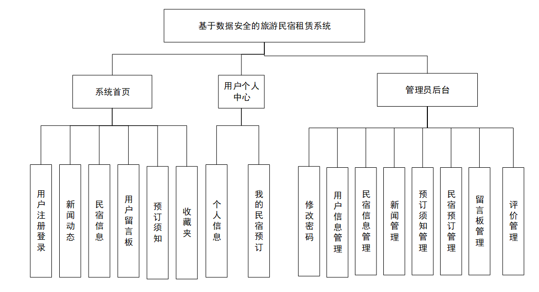 (2)系统需求分析及系统设计:基于用户需求分析内容,明确系统主要功能架构,功能呈现包含了民宿信息管理、民宿预定管理、民宿预订管理等内容,同时结合数据库设计进一步完善数据内容及数据从属关系。