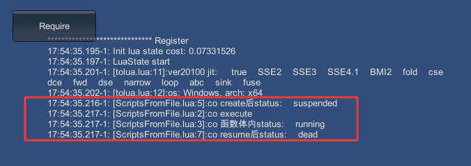 if (GUI.Button(new Rect(50, 50, 120, 45), "DoFile")){//strLog = "";LuaFunction luaFunc = lua.GetFunction("funcResume");if (luaFunc != null){luaFunc.BeginPCall();luaFunc.PCall();luaFunc.EndPCall();}}