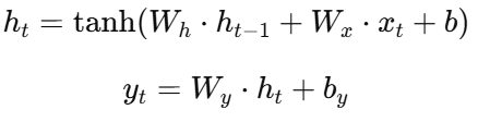 RNN 通过循环连接,使当前时间步的输出依赖于前一个时间步的隐藏状态: