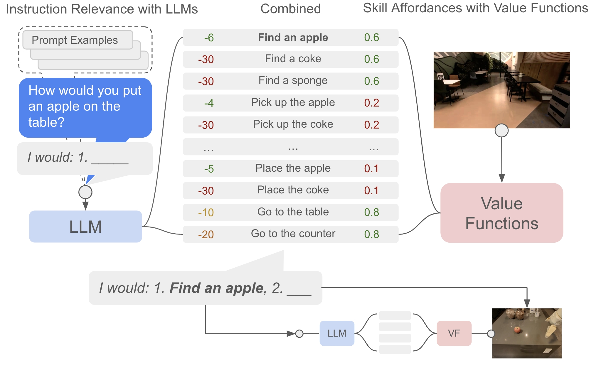 现在我们将LLM的Say与示能函数的Can结合。在每一步技能决策,LLM根据指令上文给出技能的任务基础p(lπ∣i)p(\mathscr l_\pi|i)p(lπ∣i),示能函数根据机器人物理状态给出技能的世界基础p(cπ∣s,lπ)p(c_\pi|s,\mathscr l_\pi)p(cπ∣s,lπ)。最终二者相乘得到的概率(在工程实践中采取对数概率相加)是SayCan选择技能的依据