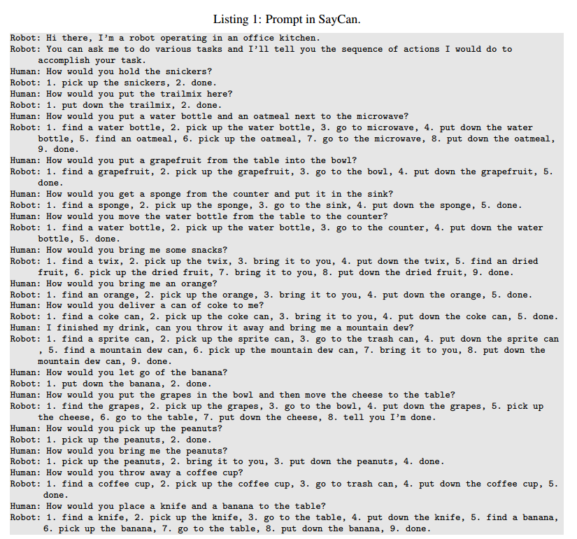 但是LLM仅仅基于上下文完成任务,无法直接获得来自物理世界的信息,包括机器人处于什么样的环境与状态,某个行动会对现实产生什么样的影响等等。LLM具有分析并响应自然语言指令的能力,即“Say”,但机器人能不能理解其响应,进而又能不能在现实世界中执行,即“Can”,LLM自身则无法保证。