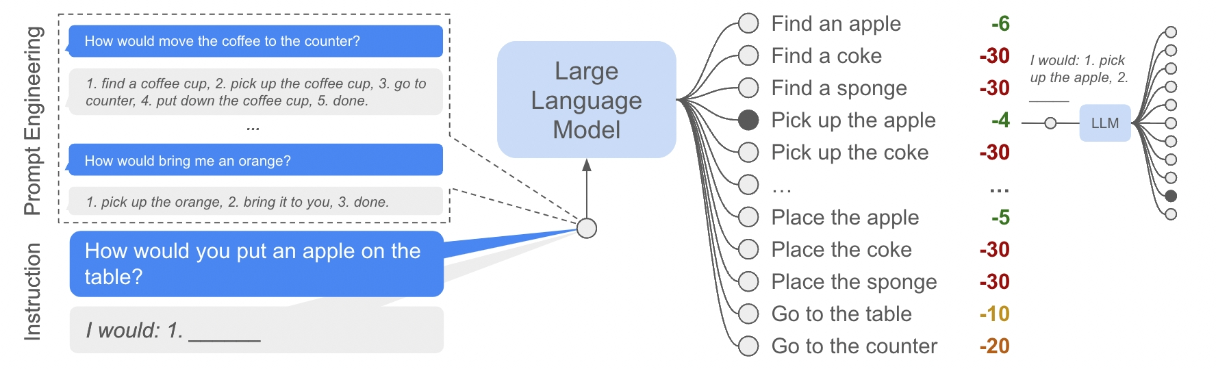 一个原始的LLM能够合理地响应我们给出的指令,但它不知道如何以机器人可以理解的方式,即低级技能序列作为响应。一种方法是依赖提示词工程,但这仍然无法对其输出进行严格的约束。为此,SayCan没有让LLM直接生成技能文本,而是为给定的文本计算可能性。