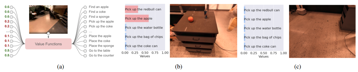 LLM给出技能的语言描述lπ\mathscr l_\pilπ是用户指令iii的有效下一步的概率p(lπ∣i)p(\mathscr l_\pi|i)p(lπ∣i),那么对于我们关注的某项技能可以被成功执行,并朝着完成指令的方向取得进展的概率p(ci∣i,s,lπ)p(c_i|i,s,\mathscr l_\pi)p(ci∣i,s,lπ)有