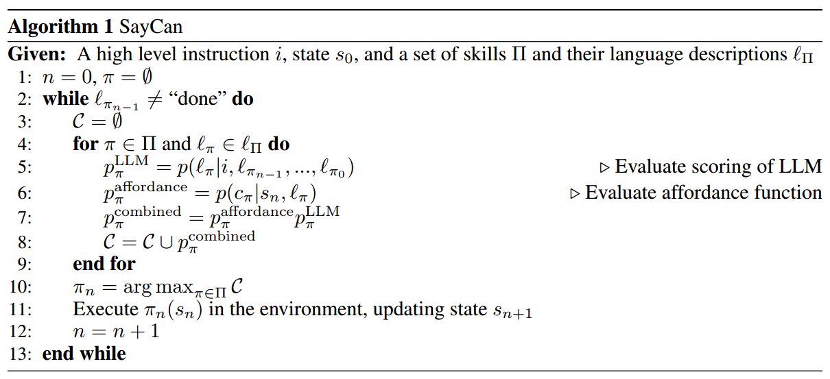 技能选择完毕后,智能体执行对应的策略,LLM将对应的技能描述纳入指令,随后进行下一轮决策,直至SayCan选择了终止技能。整个SayCan算法的伪代码如下