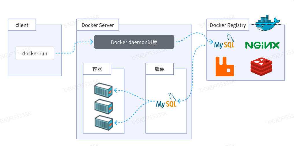 Docker本身包含一个后台服务,我们可以利用Docker命令告诉Docker服务,帮助我们快速部署指定的应用。Docker服务部署应用时,首先要去搜索并下载应用对应的镜像,然后根据镜像创建并允许容器,应用就部署完成了。