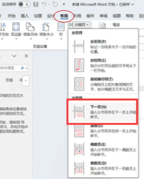 (2)点击【布局】选项卡,找到【分隔符】按钮,选择【下一页】,插入分节符(这样前后就成了两个独立章节);